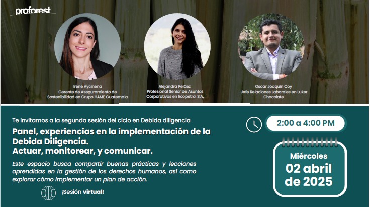 Irene Aycinena, nuestra Gerente de Aseguramiento de Sostenibilidad, participó como panelista en la segunda sesión del ciclo de Debida Diligencia organizado por Proforest Latinoamérica. Durante el evento, compartió buenas prácticas, aprendizajes y desafíos en la implementación de acciones para reducir riesgos y mitigar impactos en derechos humanos.