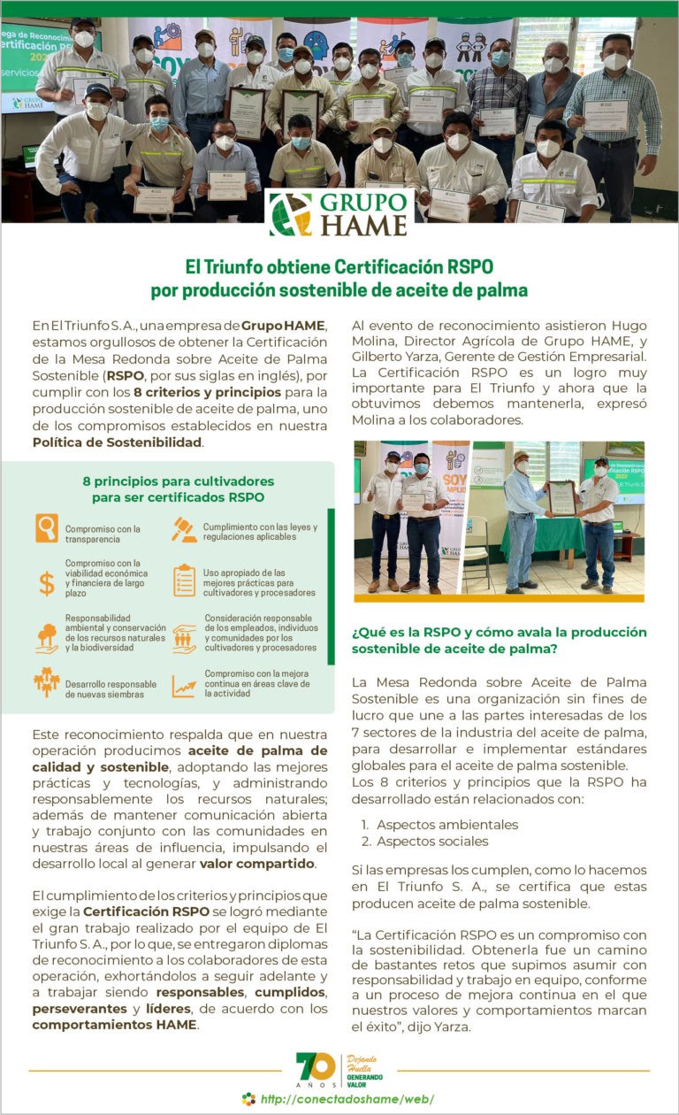 El Triunfo obtiene Certificación RSPO por producción sostenible de aceite de palma