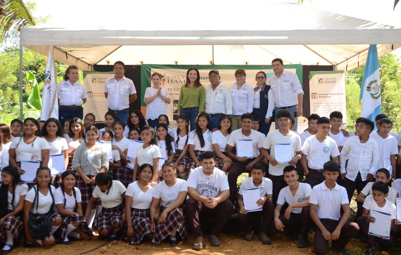 En el acto realizado en la Escuela de Campo Agroecológica (ECA) se contó con la participación de representantes de gobierno local, Ministerio de Economía, INTECAP, Fundación HAME y de Grupo HAME, quienes al finalizar la clausura visitaron las comunidades de El Tucán y Santa Rosa en las que Grupo HAME ha desarrollado proyectos de apoyo a la formación educativa y del cuidado y mejoramiento de los recursos naturales.