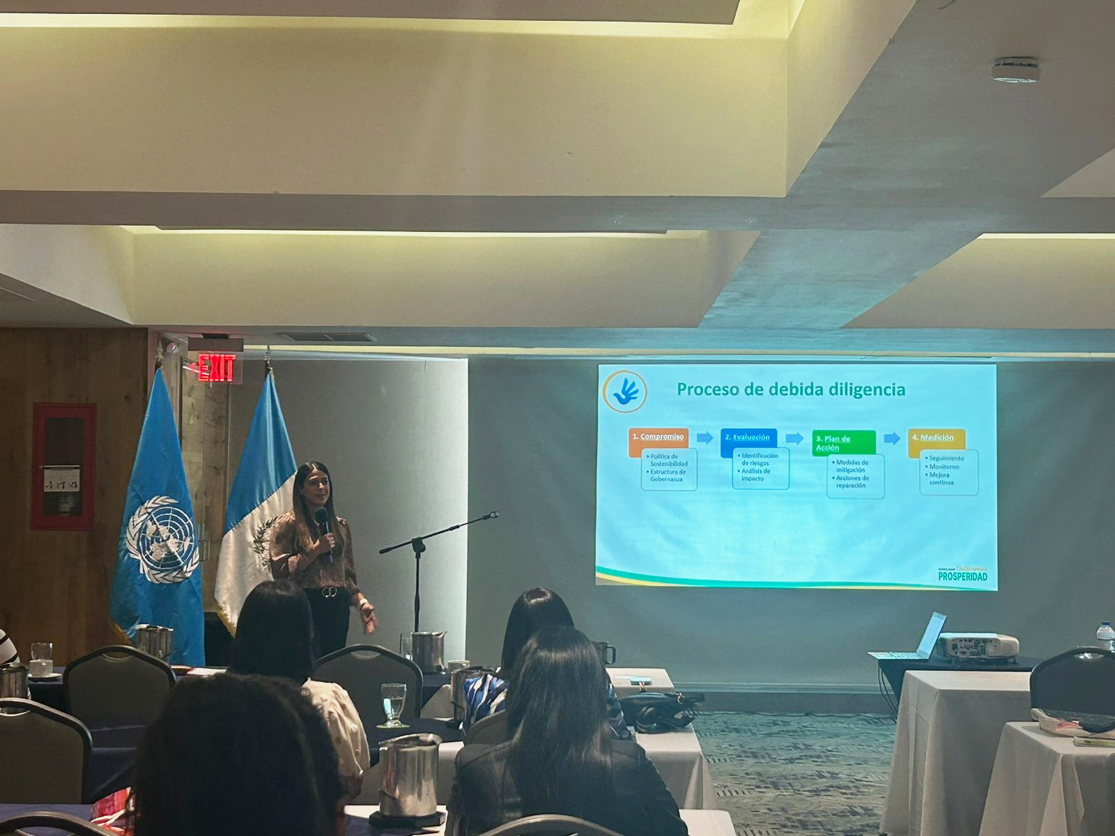 Irene Aycinena, Gerente de Aseguramiento de Sostenibilidad, participó como expositora en el Curso "Empresas y Derechos Humanos", organizado por Pacto Global, OACNUDH, UNICEF y CentraRSE, para dar a conocer cómo Grupo HAME ha liderado el proceso de Debida Diligencia. En el evento participaron empresas de la industria de manufactura, servicios y del agro. Pacto Global trabaja con el sector privado, sector público y sociedad civil para desarrollar estrategias que contribuyan a alcanzar los Objetivos de Desarrollo Sostenible (ODS).